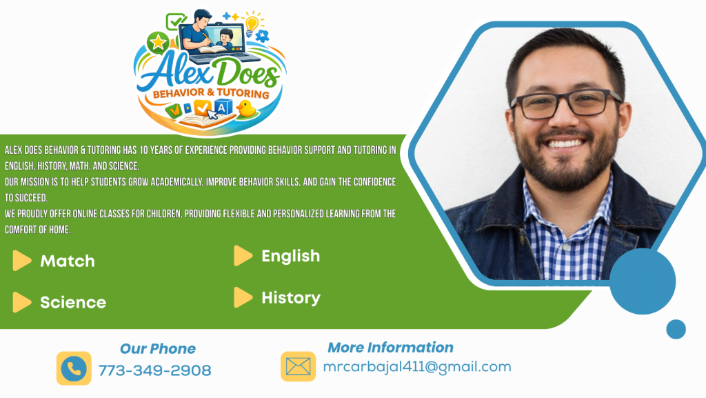 Alex Does Behavior & Tutoring offers personalized behavior coaching and academic tutoring both locally in Chicago, IL and internationally through online sessions.